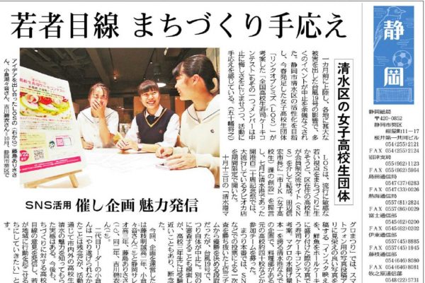 2019年より静岡市清水区の発展を目指した高校生団体LOS(Link of Shimizu)の設立運営を支援しています。 7月には静岡市行政と連携し、高校生による市長への政策提言の場「JK×大学生が清水を変える!~若者が […]